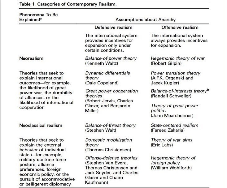 Table 1 illustrates how the offensive realism-defensive realism debate cuts across the divide between neorealism and neoclassical realism. This two-part classification scheme refers to particular theories, not particular theorists. Specific theories fall into these categories, but scholars may work in more than one category.